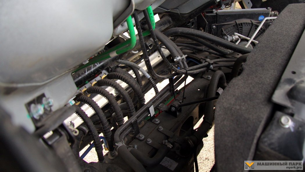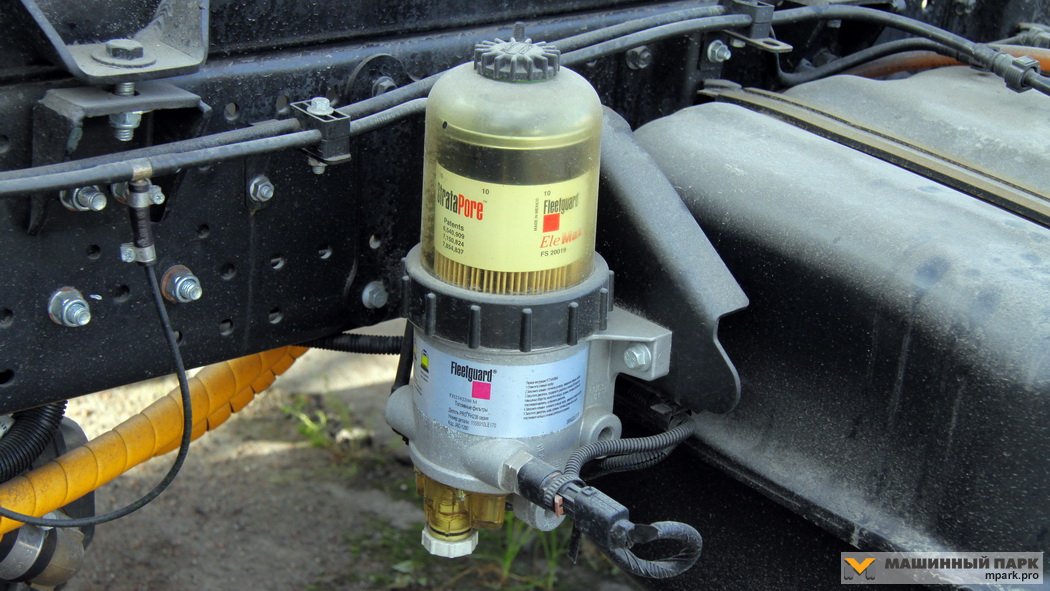 15. Здесь же расположен и подогреваемый фильтр-влагоотделитель именитой Fleetguard. Вообще, адаптация к нашему рынку у машины хорошая – в ней есть дополнительное утепление кабины и отопитель салона повышенной производительности, морозоустойчивые резиновые детали и теплоизоляционный экран на радиатор системы охлаждения, нагревательные элементы двигателя, защита двигателя и коробки передач снизу.