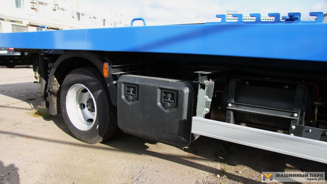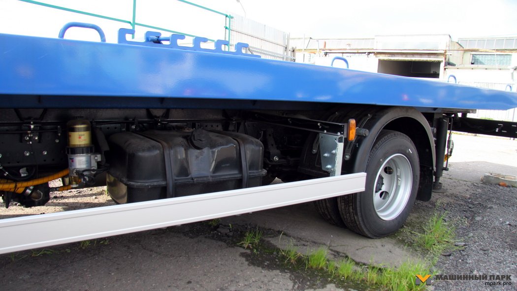 14. Главное в любом грузовике – надстройка. В данном случае – эвакуационная сдвижная платформа производства АМЗ. Ее габариты 5350х2220 мм, грузоподъемность – 3,5 т. Выполнена она аккуратно, предусмотрен и противоподкатный алюминиевый брус. На раме – 100-литровый топливный бак. Для работы в городе – достаточно, для «дальнего боя» опционально предлагается 130-литровый.