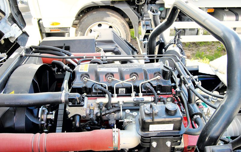 Поднимаем кабину, где обнаруживаем четырехцилиндровый дизельный Cummins ISF3.8S5168 объёмом 3,8 литра, мощностью 166 л. с. К слову, в скором времени от этого мотора откажутся: JAC подписал соглашение с американской компаний NaviStar и будет выпускать по её лицензии собственные силовые агрегаты.