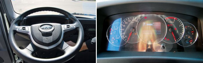 Попасть в кабину без усилий позволяют удобные поручни и противоскользящие «подножки». Интерьер, конечно, небогатый, но для коммерческого транспорта вполне подходящий. Сиденья не жёсткие, как у большинства китайских собратьев, и рассчитаны на длительные поездки.
