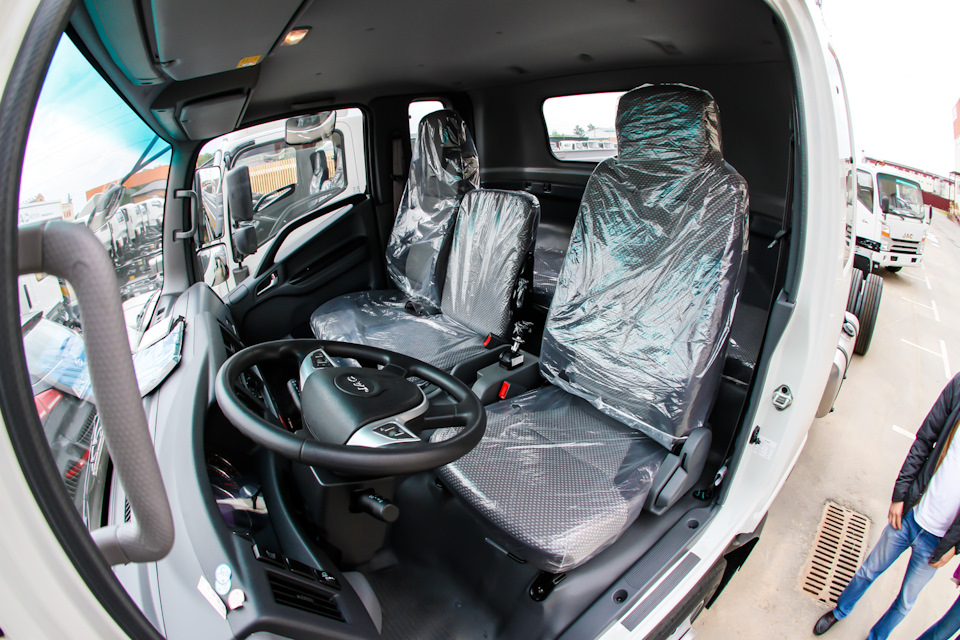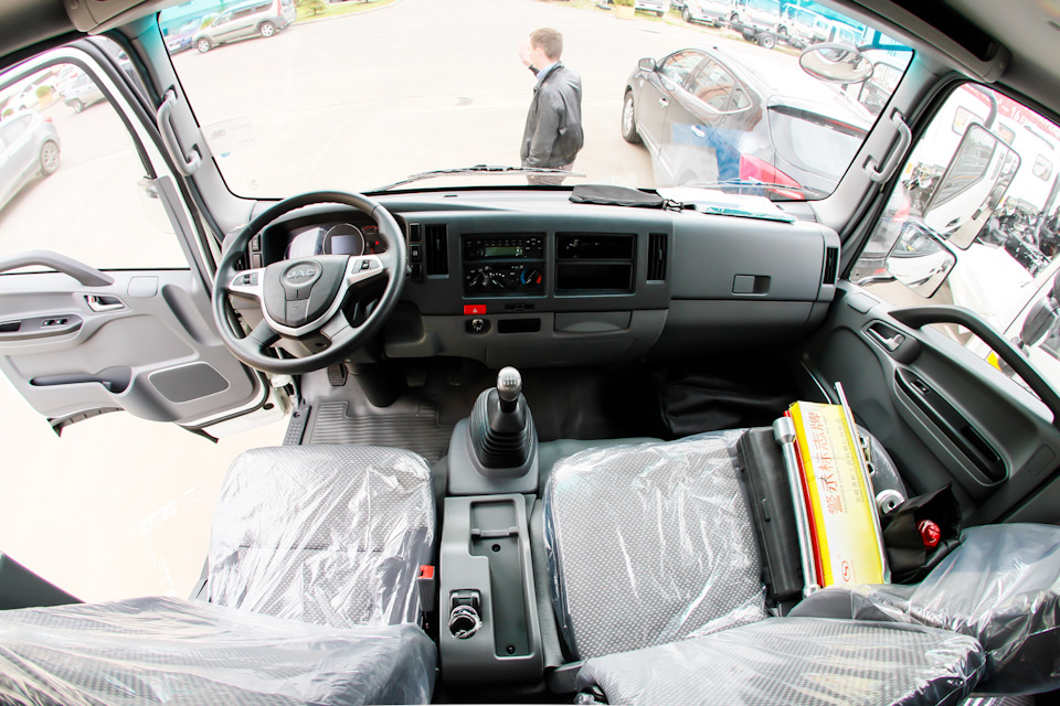 Из всей гаммы продукции JAC в России пока продаются только три грузовика N56, N75 и N120, полной массой в от 3,500 до 12000 кг. Все грузовики безкапотной компоновки, говорят, что это положительно сказывается на маневренности в городских условиях. Управлять 120 моделью было легко, но грузовик был без груза, поэтому пневматическая тормозная система останавливала его слишком резко. Грузовой опыт у меня не большой, поэтому не понятно – почему коллега справа сползал в поворотах – то ли и правда сидеть на сидении с пластиком чехле не удобно, то ли я закладывала в поворот. К тормозам привыкла минут через 15, но профессионалу, думаю, будет легче.