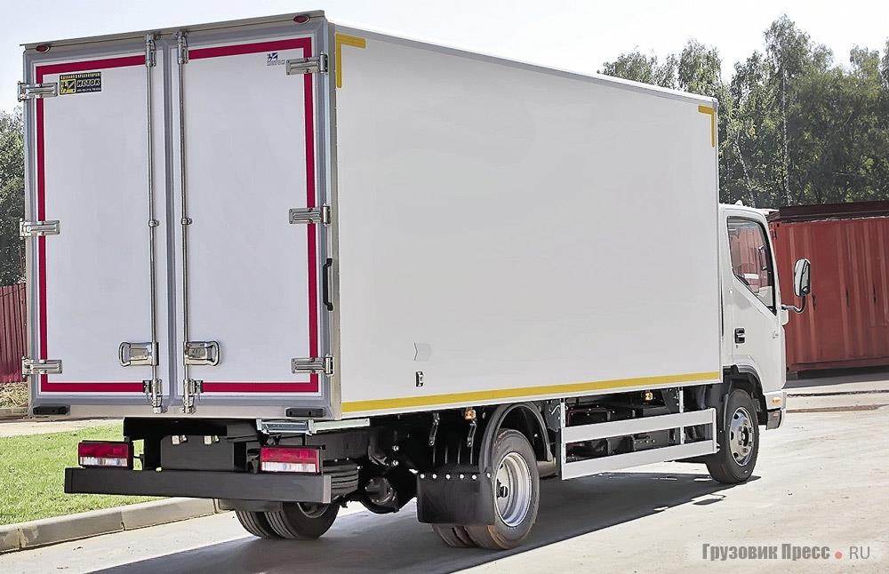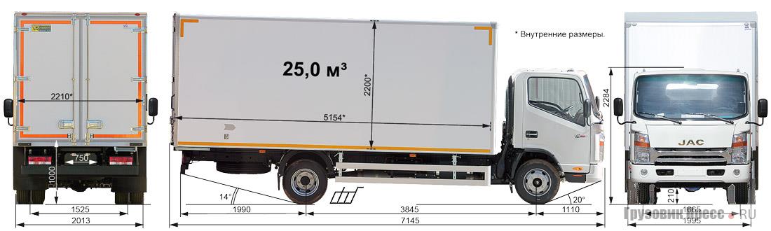 На шасси JAC N75 можно установить практически любую надстройку. В нашем тесте это фургон производства компании «Исток» из города Красногорска. Фургон с задними распашными дверями, с полимерным покрытием оцинкованных панелей, внешними габаритами 4400х2200х2200 мм и объёмом почти 22 м3 смотрится неплохо. Для удобства входа внутрь есть убирающаяся под днище металлическая лесенка и поручень. Словом, ничего необычного, но, как говорится, выполнено по принципу, известному мне по курсу высшей математики, и именуемому «необходимых и достаточных условий».