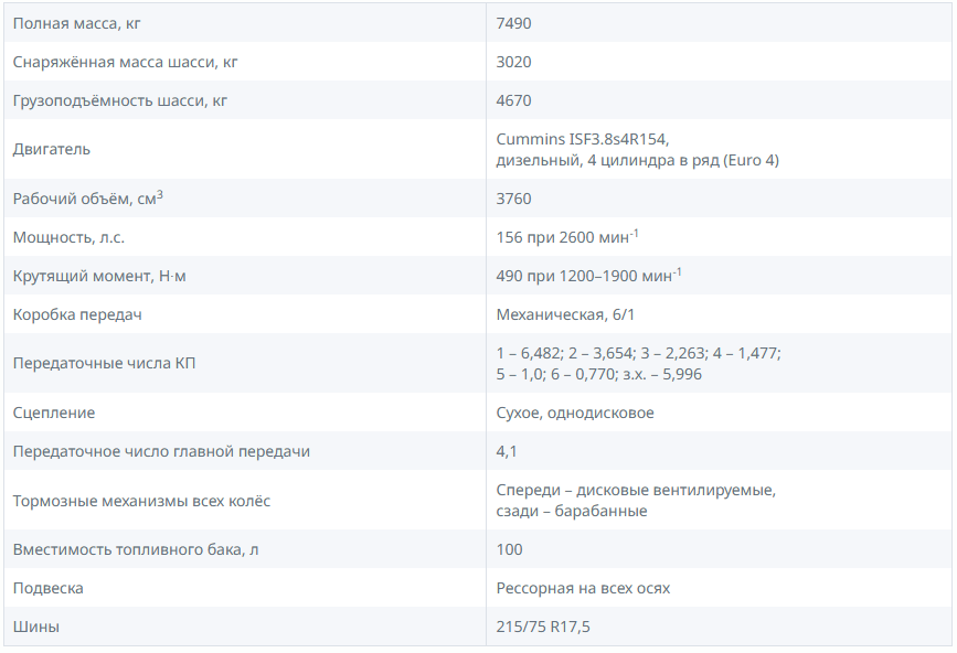 Под кабиной установлен Cummins ISF3.8s4R154, произведённый в Китае. Это 4-цилиндровый дизельный двигатель объёмом 3,8 литра, мощностью 156 л.с. при 2600 об / мин. Максимальный крутящий момент 490 Н∙м при 1200– 1900 об / мин. Двигатель соответствует экологическому стандарту Euro 4. Агрегатируется мотор с 6-ступенчатой механической КП.